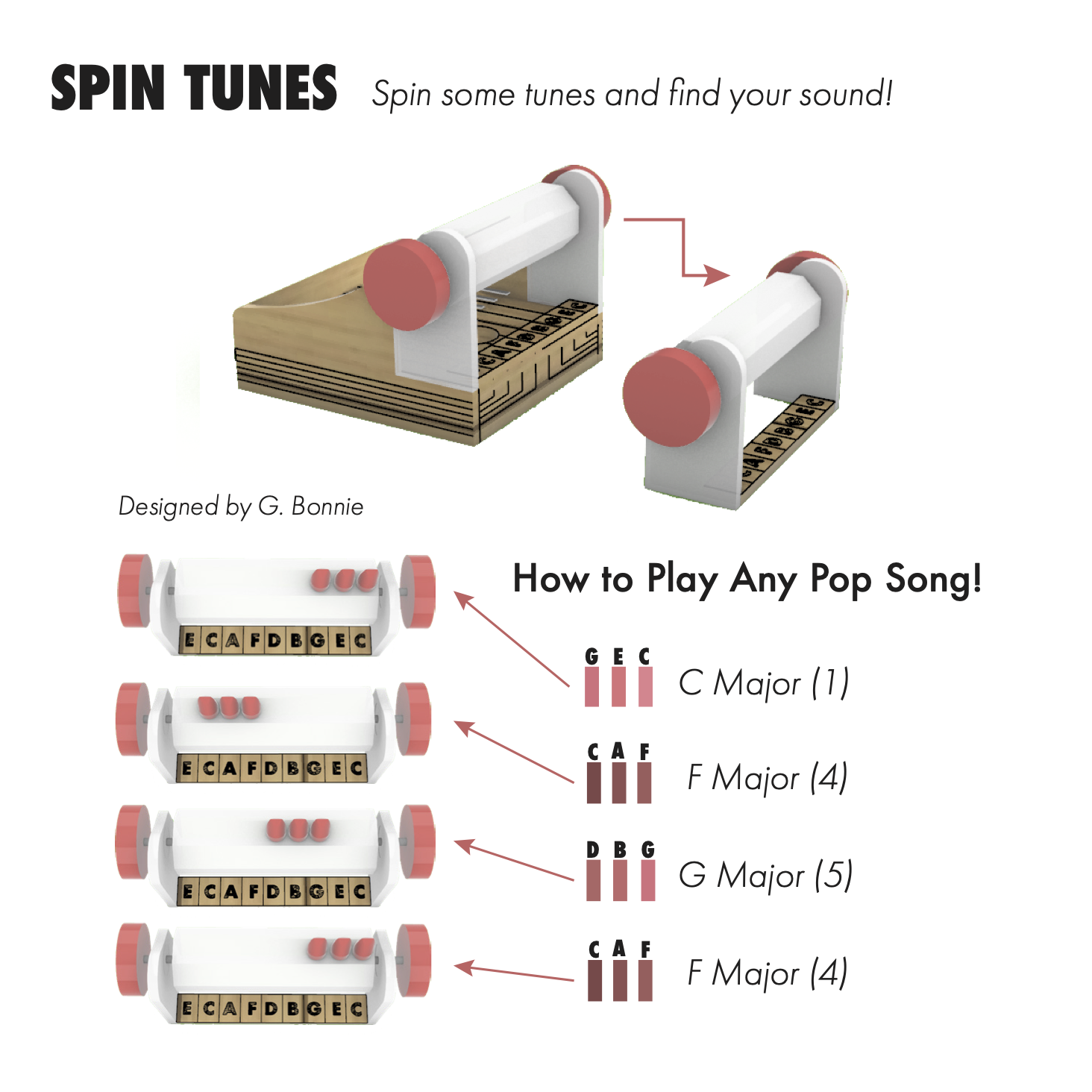 Spin Tunes is an interactive musical product. It combines the beauty and simplicity of a music box with the ability to create your own sounds. This product allows the user to place notes and chords where they see fit. It is all about finding chords and chord progressions that you enjoy.